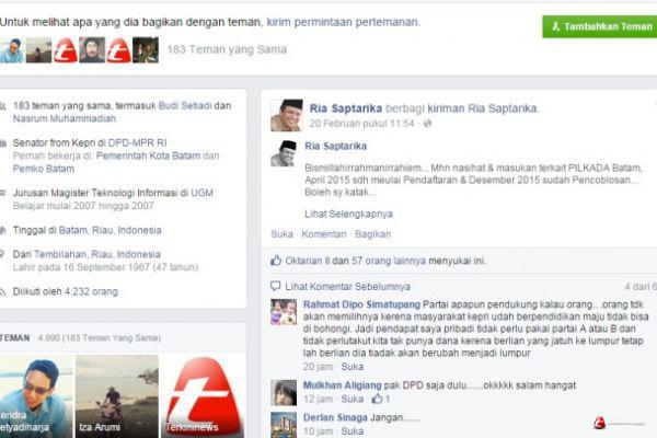 "Bismillahirrahmanirrahiem... Mhn nasihat & masukan terkait PILKADA Batam, April 2015 sdh meulai Pendaftaran & Desember 2015 sudah Pencoblosan... Boleh sy katakan banyak sekali dorongan agar saya maju di PILKADA BATAM... disisi lain saya TIDAK PUNYA PARTAI & TIDAK PUNYA DANA MEMADAI... Padahal lawan Incumbent juga cukup berat," tulisi Ria Saptarika di akun facebooknya.