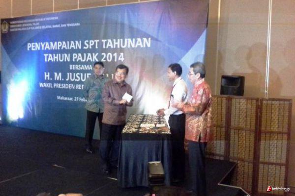Sebagaimana tahun-tahun sebelumnya, JK menyampaikan SPT Tahunan PPh Orang Pribadi sebelum jatuh tempo tanggal 31 Maret 2015. Penghargaan diterima JK disampaikan oleh Kepala Kantor Wilayah (Kanwil) Direktorat Jenderal Pajak (DJP) Wilayah Sulawesi Selatan, Barat dan Tenggara di Makassar, Jumat (27/2).