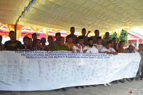 KARIMUN - Dukungan agar H.Aunur Rafiq maju pada ajang Pemilihan Bupati Pilkada 2015 terus bermunculan. Sabtu (7/3), bertempat di Parit Muda Km II Tanjungbatu Kota Kecamatan Kundur, diadakan aksi penggalangan sejuta tanda tangan diatas kain putih berupa spanduk sepanjang 5 meter bagi H.Aunur Rafiq atau AR untuk menjadi Bupati Kabupaten Karimun.