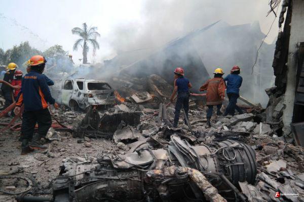 Sebuah pesawat TNI Angkatan Udara (AU) jenis Hercules C130 jatuh di Jalan Jamin Ginting, Medan, Sumatera utara, Selasa (30/6/2015). Pangkoops 1 TNI AU, Marsda Dwi Putranto mengaku bahwa pesawat tersebut tengah melakukan penerbangan rutin.