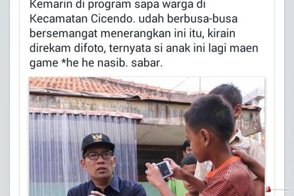 "Kemarin di program sapa warga di Kecamatan Cicendo udah berbusa-busa bersemangat menerangkan ini itu, kirain direkam foto, ternyata si anak ini lagi main game he he nasib sabar," tulis Ridwan Kamil di akun facebooknya Ridwan Kamil.