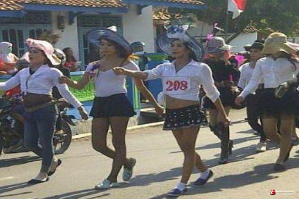 TANJUNGPINANG - Lomba gerak jalan memperingati Hari Ulang Tahun (HUT) kemerdekaan Republik Indonesia ke 70 tahun, Selasa (25/08/2015) pagi di Kota Tanjungpinang, Provinsi Kepri, berlangsung meriah. Kemeriahan muncul dari aksi para peserta yang datang dengan busana yang unik. Tak mau ketinggalan, satu kelompok peserta datang dengan pakaian seksi.