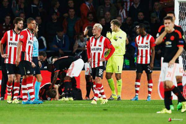Shaw menerima tekel keras dari Hector Moreno ketika ia berlari menuju kotak penalti PSV. Mantan bek Southampton itu terlihat kesakitan dan memaksa pertandingan terhenti selama 10 menit karena tim medis melakukan perawatan darurat. Marcos Rojo pun turun menggantikan Shaw, seiring Louis van Gaal menghibur Shaw di pinggir lapangan.