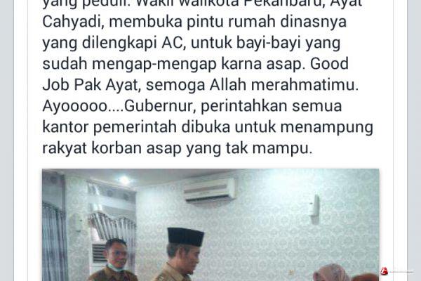 "Alhamdulillah, masih ada pejabat di negeri ini yang peduli. Wakil walikota Pekanbaru, Ayat Cahyadi, membuka pintu rumah dinasnya yang dilengkapi AC, untuk bayi-bayi yang sudah mengap-mengap karna asap. Good Job Pak Ayat, semoga Allah merahmatimu. Ayooooo....Gubernur, perintahkan semua kantor pemerintah dibuka untuk menampung rakyat korban asap yang tak mampu," tulisnya.