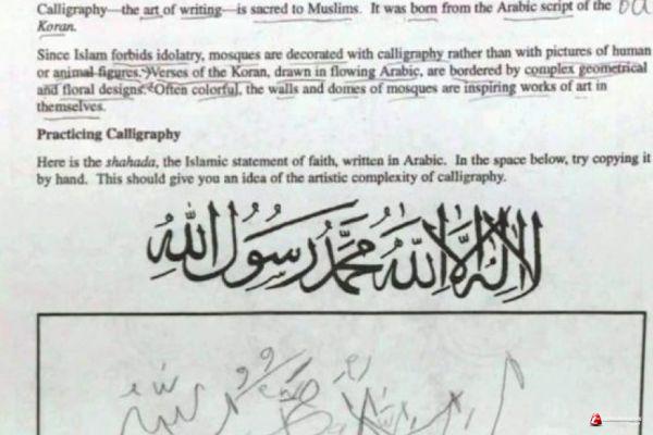 Sepekan lalu, para siswa di Riverheads High School yang sedang mempelajari Timur Tengah diminta menyalin kaligrafi Arab. Sejumlah siswa menolak tugas itu.