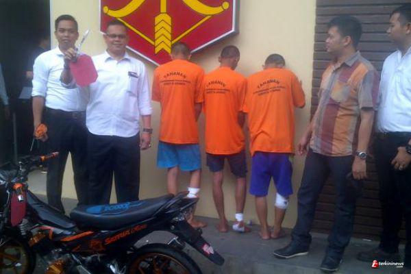 "Ketiga tersangka beserta barang bukti pisau dan satu unit motor hasil begal tersangka kini sudah kita amankan, sedangkan pelaku M kini sedang dalam pengejaran. Akibat ulahnya tersangka akan kita jerat pasal 365 KUHP," tandas Irsan.