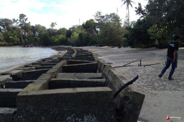 Sementara abrasi ditambahkannya terus terjadi. Bahkan membuaat pohon-pohon besar di bibir pantai semakin condong kelaut karena akarnya terkikis ombak.