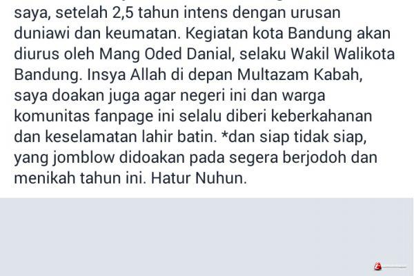 BANDUNG - Walikota Bandung Ridwan Kamil akan melaksanakan ibadah Umrah dalam sepekan. Dalam akun facebooknya dia menyerahkan kepemimpinan Bandung sementara kepada wakil walikota Pers Danial yang juga merupakan politisi PKS.