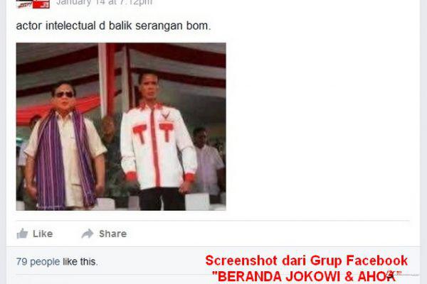 "Actor intelektual di balik serangan bom," tulis Ari Agung Martanto usai kejadian Bom Sarinah, Kamis (14/1/2016). Tulisan itu disertai foto Prabowo Subianto bersama Hercules, preman legendaris penguasa Tanah Abang.