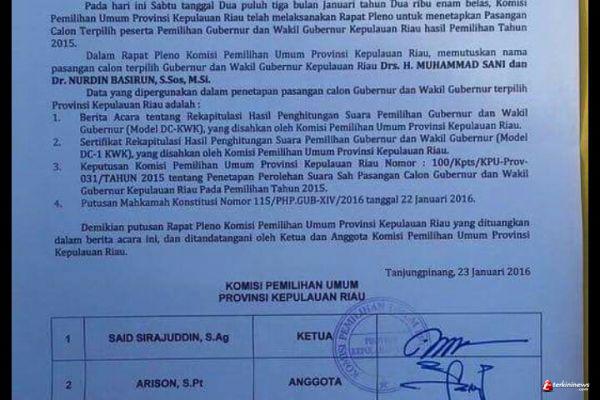 TANJUNGPINANG - Sore ini Sabtu (23/1) KPU Kepri resmi menetapkan pasangan Sani - Nurdin sebagai pemenang dalam Pilkada Kepri 9 Desember 2015 silam dan pasca penolakan gugatan SAH di MK.