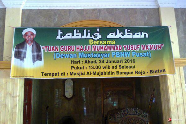 BINTAN - Dalam rangka menyambut tabligh akbar bersama Tuan Guru Hajji Muhammad Yusuf Mamun dari Dewan Mustasyar PBNW Pusat di mesjid al-mujahidin bangun rejo Kabupaten Bintan yang akan digelar besok Minggu, 24 Januari 2016 pukul 13.00.