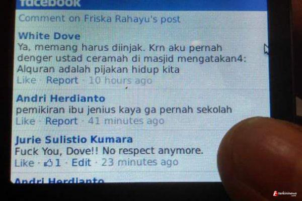 KARIMUN - Media sosial (medsos) dibuat heboh oleh postingan bernada melecehkan Al quran di medsos Facebook. Postingan menghebohkan yang di postingkan oleh dengan akun Facebook White Dove ini bertuliskan "Ya Memang harus diinjak. Km aku pernah dengan ust ceramah di masjid mengatakan4 Al quran pijakan hidup kita".