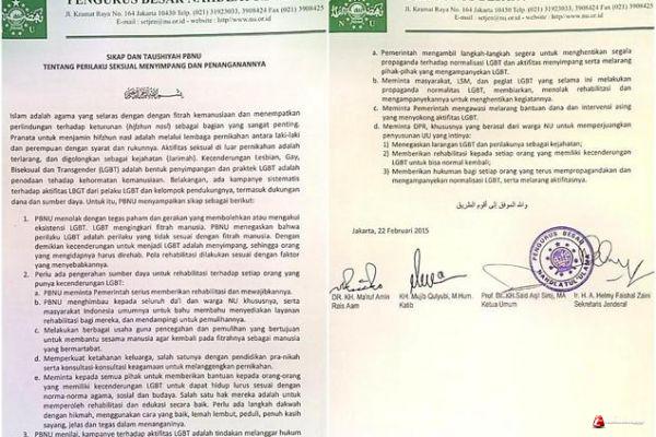 1. PBNU menolak dengan tegas paham dan gerakan yang membolehkan atau mengakui eksistensi LGBT.