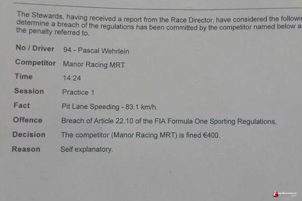 Setelah mendapat laporan dari Race Director, Steward memutuskan Wehrlein melanggar pasal 22 ayat 10 peraturan yang dibuat FIA. Mantan pembalap cadangan Tim Mercedes, melanggar batas kecepatan maksimum yang ditetapkan. Wherlein melaju dengan kecepatan 83,1 km/h dari 60km/h yang ditetapkan oleh FIA.