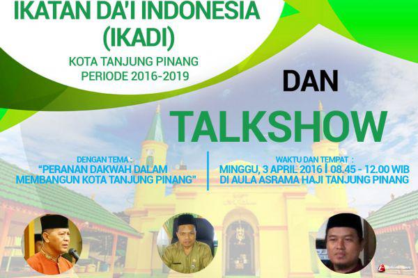 Bersamaan dengan digelarnya pelantikan tersebut, Ikadi juga menggelar talk show dengan tema "Peran Dakwah Dalam Membangun Kota Tanjungpinang" Talkshow tersebut akan menghadirkan 3 pemateri yaitu H. Syahrul, S.Pd , Ketua DMI Kota Tanjungpinang yang akan membawakan subtema "Peran Masjid sebagai Pusat Dakwah". Selanjutnya Drs. H. Muhammad Nasir, S.Ag, MH, Kepala Kankemenag Kota Tanjungpinang yang akan membawakan subtema "Peran Pemerintah dalam mengantisipasi Paham Radikal di Kota Tanjungpinang" dan pemateri ketiga yaitu Ust Zainal Mutaqin, Lc, MA (PW Ikadi Provinsi Kepri) subtema "Spirit Dakwah Rahmatan Lil 'Alamin".