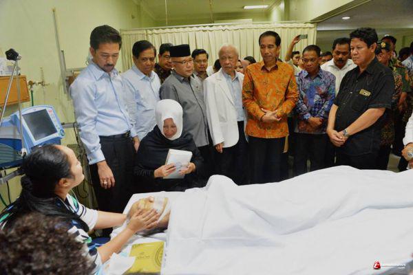Setelah turun dari mobilnya, Jokowi langsung masuk ke rumah sakit itu. Tak lama setelah Jokowi, Wakil Presiden Jusuf Kalla juga tiba di Rumah Sakit Abdi Waluyo.