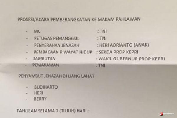 Berikut tertib prosesi acara pemakaman gubernur Kepulauan Riau Drs. H. Muhammad Sani.