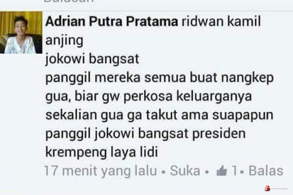 Dalam postingannya, Adrian menyebutkan kalimat-kalimat tidak senonoh dan terkesan menantang Presiden dan Walikota Bandung tersebut. Melihat postingan yang di screenshot dan disebarkan tersebut, para pengguna facebook lainnya sontak geram lalu membalasnya dengan kembali menghujat akun Adrian. “ciri-ciri orang pengecut cuma bisa nyamar, tangkap aja ni orang” begitu salah satu komentar yang diberikan oleh seorang netizen di facebook.