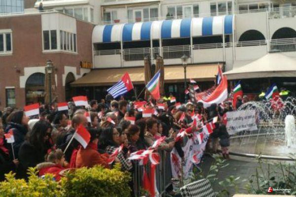 Di sebelah kanan, tampak orang-orang yang mengibarkan bendera merah putih. Mereka adalah warga Indonesia pendukung Presiden Jokowi di Belanda. Dengan semangat mereka menyanyikan yel-yel yang mendukung Jokowi dan melantunkan lagu perjuangan Indonesia, sebagaimana dilaporkan oleh wartawan Indonesia di Den Haag, Rika Theo.