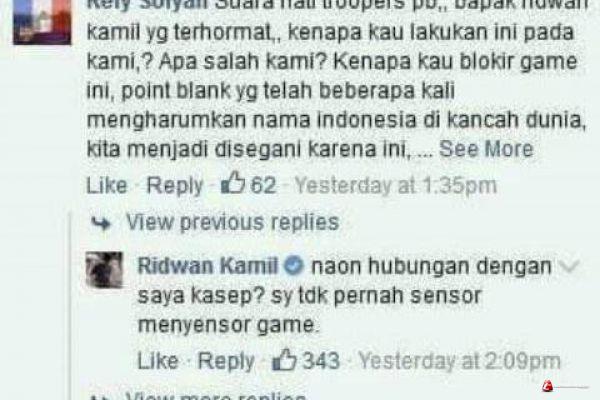 “Suara hati troopers pb (point blank)., bapak ridwan kamil yg terhormat, kenapa kau lakukan ini kepada kami? Apa salah kami? Kenapa kau blokir game ini, point blank yang telah beberapa kali mengharumkan nama Indonesia di kancah dunia…” Sebut Revy dalam status facebooknya.