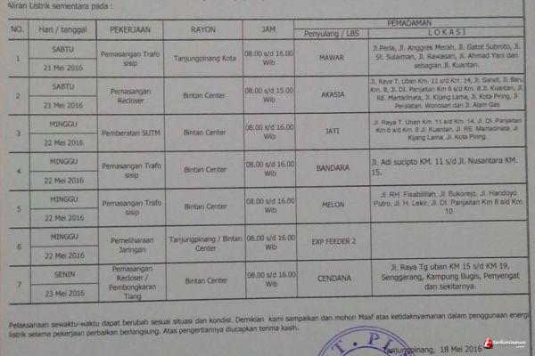 Berdasarkan surat pemberitahuan dari PT PLN pemadaman ini dilakukan karena adanya pekerjaan pemeliharaan jaringan distribusi oleh PT PLN untuk wilayah Tanjungpinang.