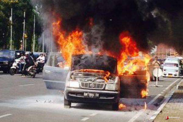 PEKANBARU-Satu unit mobil Toyota Kijang BM 1884 TO tiba-tiba terbakar saat melintas di Jalan Gajah Mada, tepatnya di depan kantor Ditreskrimsus Polda Riau, Rabu (08/06/16) pukul 15.30 WIB sore. Kejadian mengejutkan itupun sontak membuat pengendara lain yang berada di TKP mendadak panik dan berhamburan menjauhi lokasi