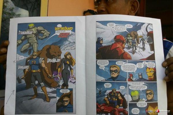 " Dibeli dipekanbaru sekitar sebulan yang lalu oleh anak saya, karena cucu saya ini sangat hobi cerita komik dan pemeran pahlawannya. Hal ini baru saya sadari ternyata ada lambang arit dan palunya yang dipadukan dikostum pemeran pahlawan didalam komik ini,"akunya.