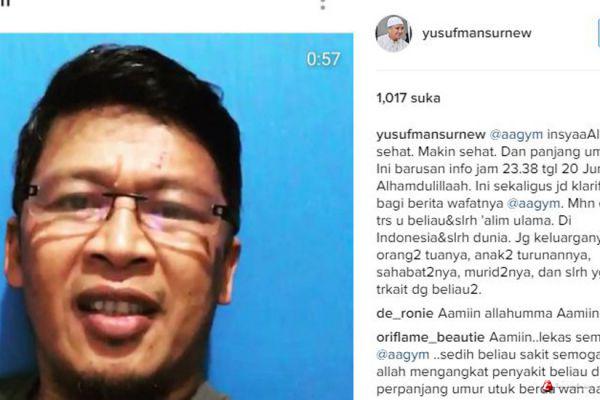 "@aagym Insya Allah sehat. Makin sehat. Panjang umur. Ini barusan (dapat info) jam 23.38 tanggal 20 Juni (dari AA Gym). Alhamdulillah (AA Gym Sehat). Ini sekaligus untuk klarifikasi berita wafatnya @aagym," ujar pria yang juga rajin menulis buku ini melalui akun Instagramnya, @yusufmansurnew, Senin (20/6) malam. (jawapos)