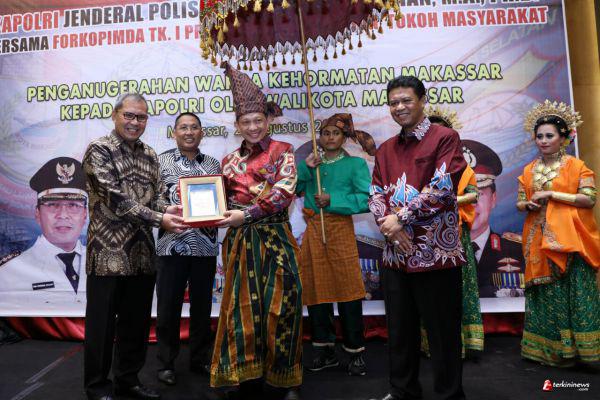 MAKASSAR, -- Kapolri Pol. Tito Karnavian dianugerahi jadi warga kehormatan Kota Makassar. Hal ini terlihat saat malam ramah tamah Kapolri Jenderal Pol Tito Karnavian bersama Forkompinda TK I Prov Sulsel dan Tokoh Masyarakat di hotel Novotel, Senin (22/08/2016).