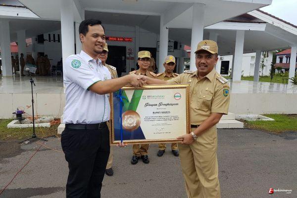 Kepala BPJS Kesehatan Cabang Utama Makassar, Drg. Unting Patri Wicaksono Pribadi, MM, AAK menyerahkan Piagam Penghargaan kepada Bupati Maros senin (06/02/2017). bertempat di Lapangan Pallantikang Maros, atas komitmennya dalam menjamin masyarakat kabupaten Maros untuk hidup sehat dan sejahtera melalui Integrasi Jamkesda dalam Program JKN-KIS sekaligus menyerahkan secara simbolis Kartu JKN-KIS PBI APBD.