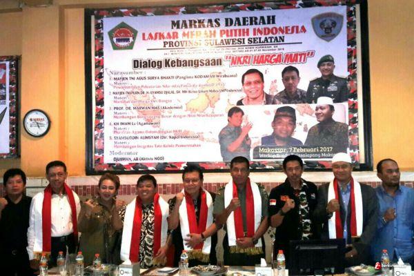 MAKASSAR, -- Ketua Markas Daerah Laskar Merah Putih Indonesia Provinsi Sulawesi Selatan , Andi Nur Alim memberikan selendang sutera merah putih kepada seluruh narasumber dialog kebangsaan yang bertema NKRI harga mati yang di laksanakan pada hari selasa 7 februari 2017 di warkop bundu talasalapang makassar sulawesi selatan.