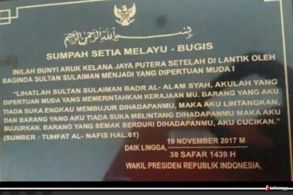 LINGGA - H. Muhammad Jusuf Kalla Wakil Presiden (Wapres) Republik Indonesia dijadwalkan akan menandatangi prasasti batu tertulis Sumpah Setia Melayu-Bugis di Daik Kabupaten Lingga, Minggu (19/11/2017).