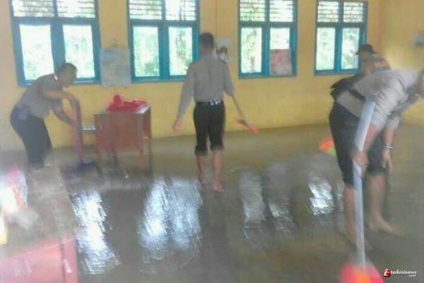 LINGGA - Polsek Lingga bersama warga lakukan gotong royong membersihkan sekolah dasar yang terendam banjir wilayah Ibukota Kabupaten Lingga bertempat di kampung putus.