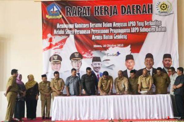 BINTAN - Pemerintah Daerah Kabupaten Bintan bersama DPRD Kabupaten Bintan menandatangani Komitmen Bersama dalam rangka penyusunan menuju APBD yang berkualitas lewat Program Sistem Perumusan Perencanaan Penganggaran APBD.