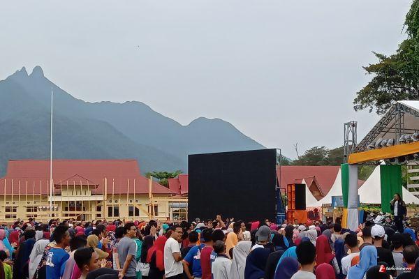 LINGGA - Ribuan warga ibukota kabupaten Lingga pagi ini Ahad(17/2/2019) tumpah ruah di halaman kantor Bupati Lingga untuk bersenam bersama dengan dihibur oleh artis Malaysia Poey Sting.