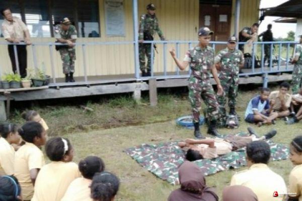 PAPUA, -- Selain tugas pokok sebagai Satgas perbatasan RI-PNG. Satgas Yonif 725/Woroagi Kodam XIV/Hasanuddin juga sempatkan memberikan latihan pengenalan Pertolongan Pertama Pada Kecelakaan (P3K) dan Pertolongan Pertama di Lapangan (Longmalap) kepada anak-anak Pramuka SMPN 1 Senggi Distrik Senggi Kabupaten Keerom, dibawah arahan Dansatgas Letkol Inf Hendry Ginting S., S.I.P.