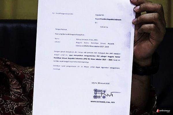 Dalam surat, Wahyu menyatakan dengan penuh kesadaran diri tanpa paksaan mengundurkan diri sebagai anggota KPU masa jabatan 2017-2022.
