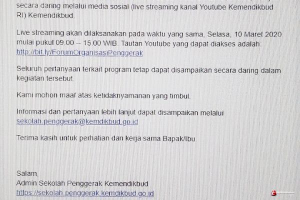 JAKARTA, -- Kementerian Pendidikan dan Kebudayaan kembali melakukan hal yang menggelikan dengan cara membatalkan forum organisasi penggerak yang Rencananya akan dilaksanakan di Kemdikbud dibatalkan dan diubah menjadi di forum daring melalui media sosial. Senin (9/3/2020) terkininews.com