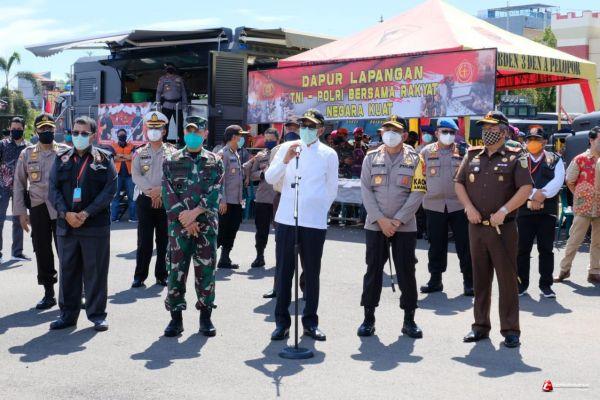 MAKASSAR, -- Gubernur Sulsel, Ir.H.Nurdin Abdullah, Pangdam XIV /Hasanuddin Mayjen TNI Andi Sumangerukka, Kapolda Sulsel Irjen Pol Drs. Mas Guntur Laupe dan unsur Forkopimda lainnya memantau fasilitas dapur lapangan yang disiapkan oleh Satuan Brimob Polda Sulsel di markasnya jalan KS Tubun Makassar.
