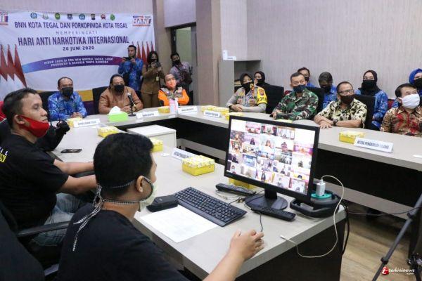 Tegal – Wali Kota Tegal H. Dedy Yon Supriyono, S.E., M.M., dan Wakil Wali Kota Tegal Muhamad Jumadi, S.T., M.M., serta Kepala BNN Kota Tegal Drs. Igor Budi Mardiyono menjadi bagian dari Upacara Peringatan Hari Anti Narkoba Internasional (HANI) Tahun 2020 secara virtual dan mendengarkan pidato Presiden RI Joko Widodo yang dibacakan oleh Wakil Presien RI KH. Ma’ruf Amin.