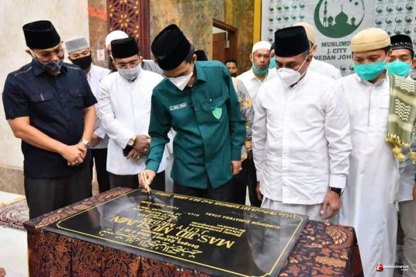 MEDAN – Gubernur Sumatera Utara (Sumut) Edy Rahmayadi bersama Ustaz Abdul Somad (UAS) meresmikan Masjid Muslimin di Kompleks J City Medan, Rabu (12/8) Semalam. Peresmian masjid ditandai dengan penandatanganan prasasti dan doa bersama.