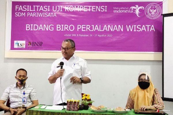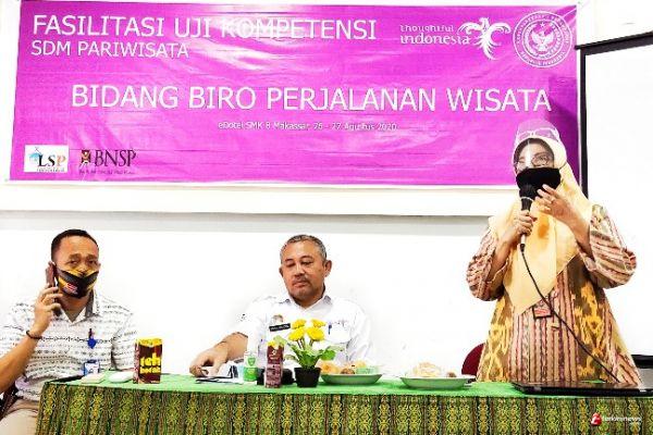 MAKASSAR, -- LSP Anging Mamiri, dan Asita bekerjasama dengan Dinas Kementerian Pariwisata Ekonomi Kreatif (Parekraf) menggelar Uji Kompetensi SDM Pariwisata Bidang Biro Perjalanan Wisata yang digelar Rabu (26/8/2020) di eDotel SMK 8 Makassar dengan menghadirkan para peserta yang berasal dari perusahaan travel di Makassar yang dihadiri Kabid P.SDP, Ketua GIPI dan Dir LSP Pariwisata Anging Mamiri.