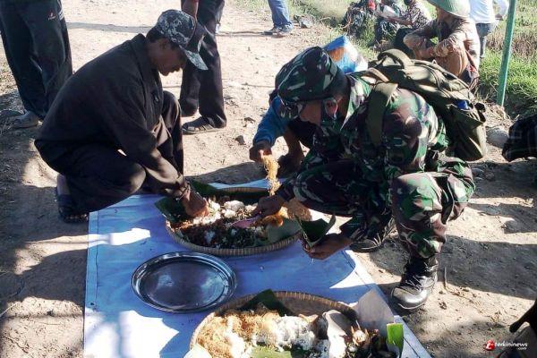 ''Walaupun makanan ndeso yang tersaji cukup sederhana yang terdiri dari nasi, kuluban/pecel, engkung ayam kampung dan yang tak mungkin tertinggal gereh/ikan asin yang disajikan di atas daun pisang. Akan tetapi rasa nya mengalahkan makanan di restaurant mewah kelas dunia. Mungkin tak lain adalah cara kebersaan makan dan bau do'a-do'a yang telah selesai di panjatkan,itulah yang di rasa makanan jadi lezat. Terpenting doa bersama ini demi kelancaran TMMD,'' ujar Lettu Inf. Nurwanto