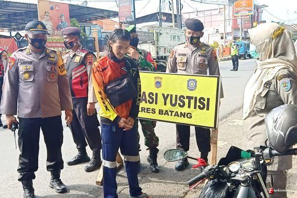 Puluhan aparat gabungan dari TNI, Polri dan Satuan Polisi Pamong Praja (Satpol PP) Kabupaten Batang mencegati pengendara yang tidak memakai masker. Tidak hanya sepeda motor atau mobil, truk pun dihentikan petugas.