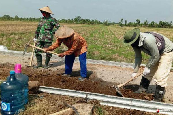 Menggunakan cangkul dan pengki anggota Kodim 0715/Kendal yang tergabung dalam Satuan Tugas TNI Manunggal Membangun Desa (TMMD) 109 mengankat tanah untuk perataan jalan.