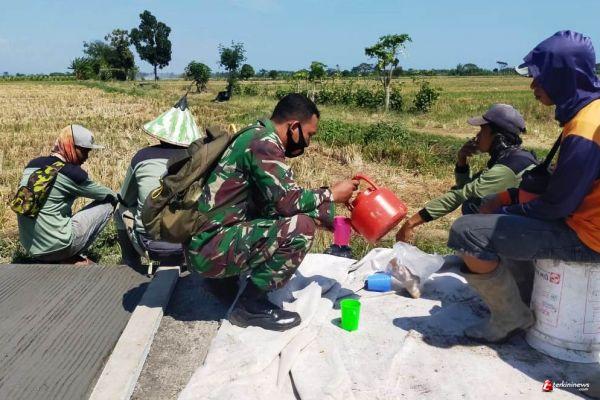 Satgas TMMD Reguler ke - 109 tahun 2020 di Desa Sendang Kulon sedang istirahat sejenak turun minum melepas lelah setelah melaksanakan pengecoran jalan di Desa Sendang Kulon, Kecamatan Kangkung, Kabupaten Kendal, Senin (14/09/20).