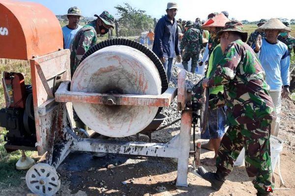 Untuk mempercepat proses pengecoran jalan di dukuh Kacangan Lor Desa Sendang Kulon Kecamatn Kangkung Kabupaten Kendal, ada salah satu anggota Satgas TMMD 109 Kendal yang mahir mengoperasikan mesin molen, Senin (14/09/2020).