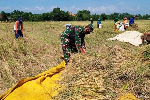 Anggota satgas TMMD 109 ini terlihat semangat tak menegenal lelah membantu memanen dan merontokan padi sawah milik salah satu warga desa Sendang Kulon.