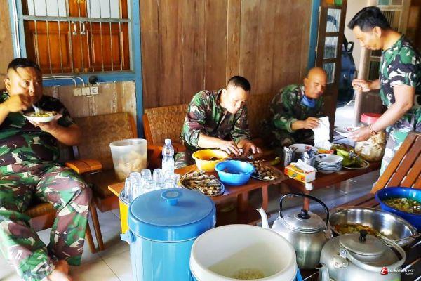 Kompak prajurit Satuan Tugas (SATGAS) TNI Manunggal Membangun Desa (TMMD) Ke 109 Kodim 0715/Kendal menikmati makan siang bersama di rumah warga setelah dari pagi fokus bekerja pada sasaran pengecoran jalan di Desa Sendang Kulon Kecamatan, Kamis (17/9/20).
