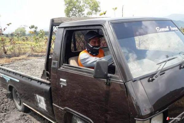 Sopir pickup pengangkut bahan banggunan ini, mengaku mendapatkan order dari langsir material dari Kali Keruh, Desa Kalinusu, menuju lokasi pengerjaan jalan.